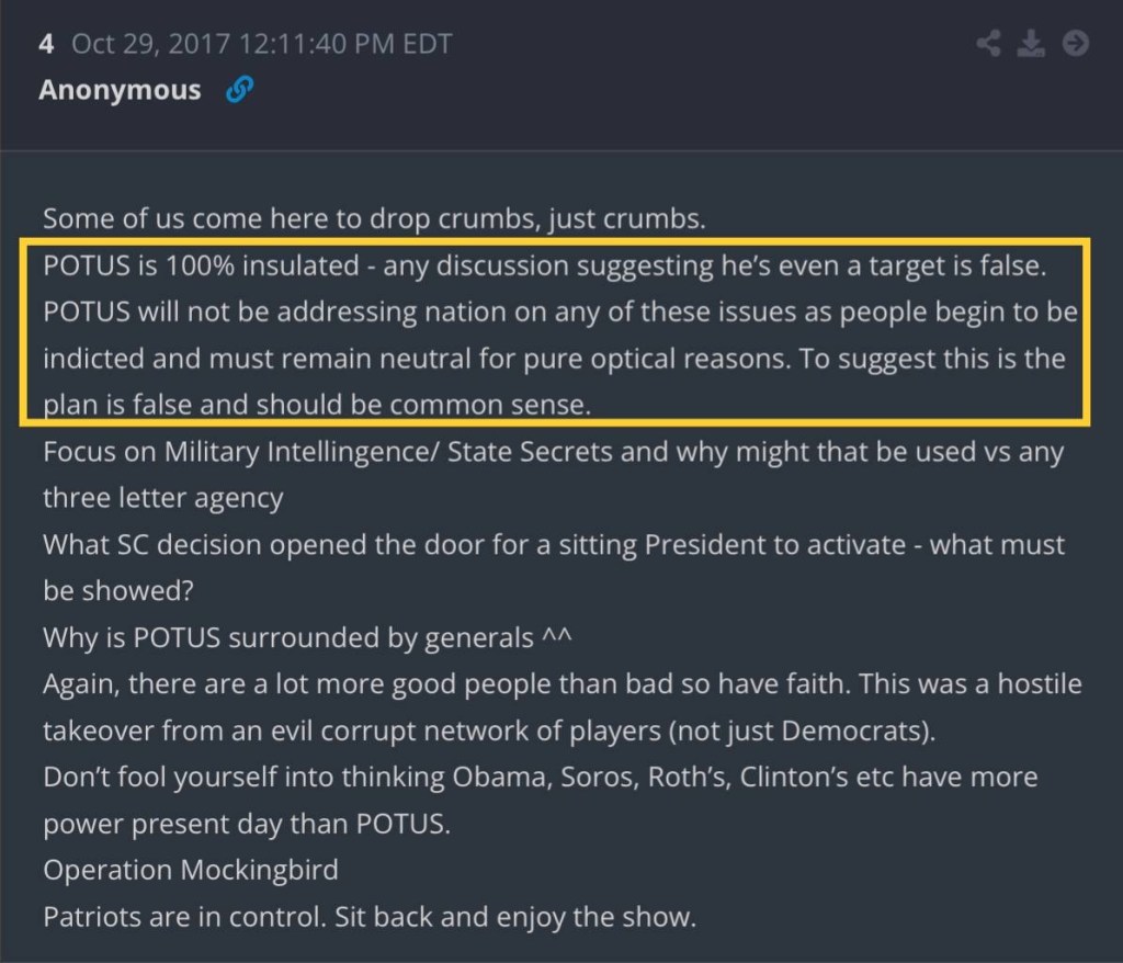 I’ve always taken this statement a little less literally than other Anons. Meaning— I don’t think they are saying that TRUMP is literally insulated in some protected place, such as an airplane, bunker or submarine.