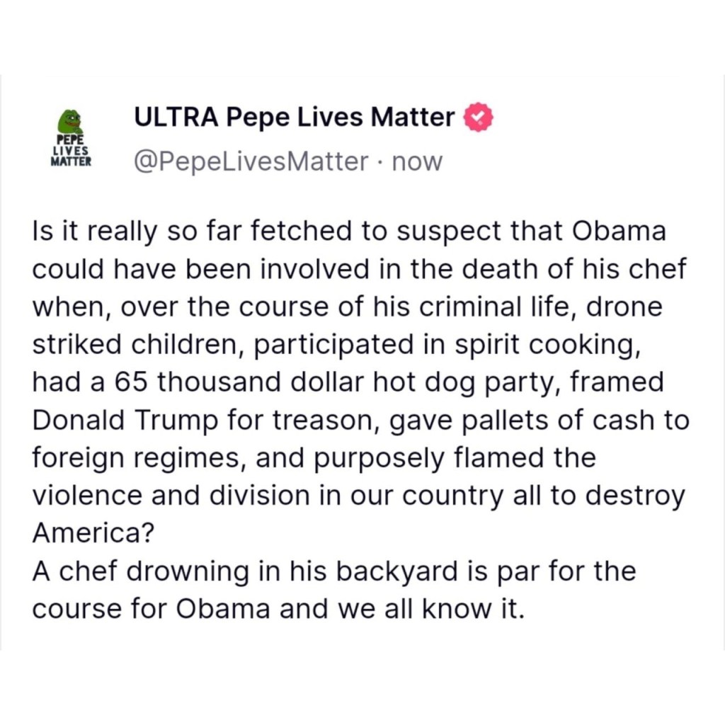 Is it really so far fetched to suspect that Obama could have been involved in the death of his chef when, over the course of his criminal life, drone striked children, participated in spirit cooking, had a 65 thousand dollar hot dog party, framed Donald Trump for treason, gave pallets of cash to foreign regimes, and purposely flamed the violence and division in our country all to destroy America?