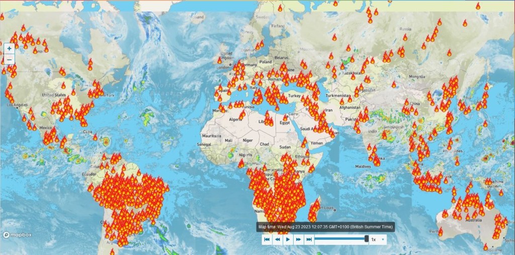 SATELLITE WILDFIRE MAP …. SAME DAY AS MAUI FIRE… WITH WEATHER WARS.. THE CONTROLLERS OF WEATHER HAVE CONTROL OVER THIS…MAN-MADE GLOBAL WARMING..