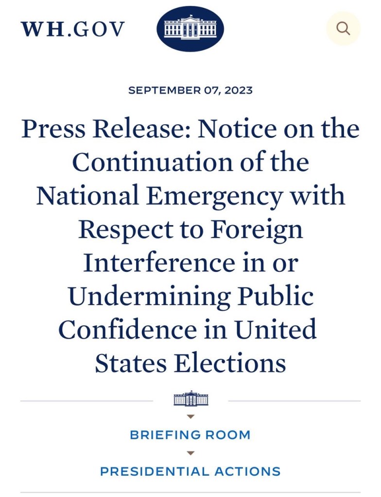 https://www.whitehouse.gov/briefing-room/presidential-actions/2023/09/07/press-release-notice-on-the-continuation-of-the-national-emergency-with-respect-to-foreign-interference-in-or-undermining-public-confidence-in-united-states-elections/