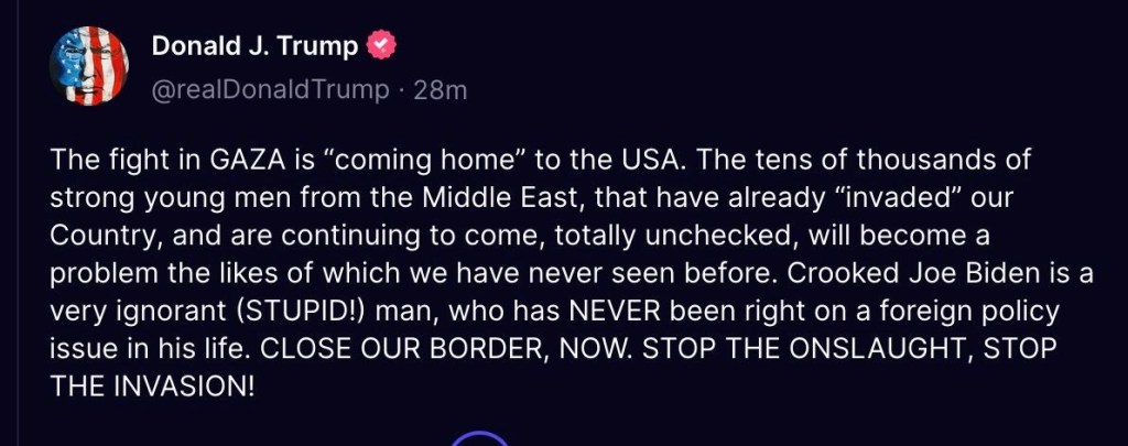 “The fight in GAZA is “coming home” to the USA. The tens of thousands of strong young men from the Middle East, that have already “invaded” our Country, and are continuing to come, totally unchecked, will become a problem the likes of which we have never seen before. Crooked Joe Biden is a very ignorant (STUPID!) man, who has NEVER been right on a foreign policy issue in his life. CLOSE OUR BORDER, NOW. STOP THE ONSLAUGHT, STOP THE INVASION!” —DJT
