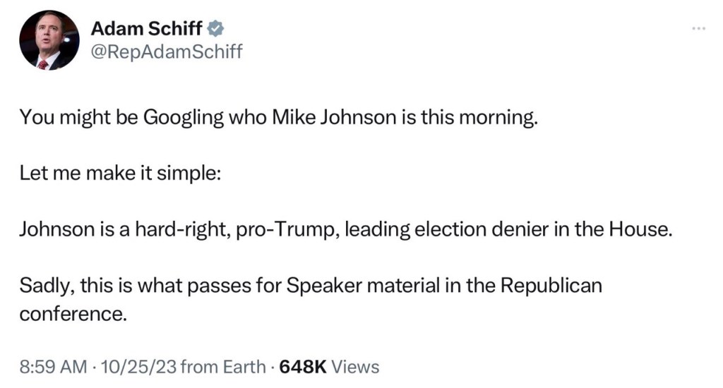 Adam’s Inverted endorsement of Mike Johnson. Wouldn’t you know it!