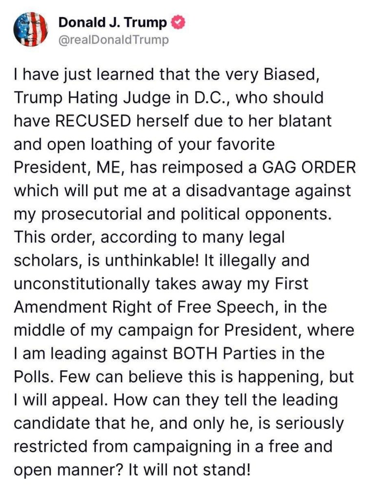 President Trump: I have just learned that the very Biased, Trump Hating Judge in D.C., who should have RECUSED herself due to her blatant and open loathing of your favorite President, ME, has reimposed a GAG ORDER which will put me at a disadvantage against my prosecutorial and political opponents. This order, according to many legal scholars, is unthinkable! It illegally and unconstitutionally takes away my First Amendment Right of Free Speech, in the middle of my campaign for President, where I am leading against BOTH Parties in the Polls. Few can believe this is happening, but I will appeal. How can they tell the leading candidate that he, and only he, is seriously restricted from campaigning in a free and open manner? It will not stand!
