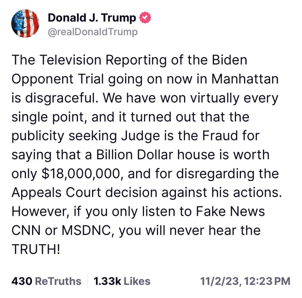 This Rigged Trial, brought by the Racist New York State A.G. Letitia James before Trump and developer Hating Judge, Arthur Engoron, which should have never been brought in that the so-called STAR WITNESS, SleazeBag Lawyer (for many people) Michael Cohen, admitted last week on the stand that he LIED, and also that your favorite President, Donald J. Trump, or anyone from the Trump Organization, NEVER TOLD HIM TO INFLATE VALUES ON FINANCIAL STATEMENTS, the opposite of what he told the A.G. in order to get this HOAX started. Therefore, on that fact alone, this Fake Case should be dismissed. Additionally, however, the Financial Statements Values are Conservative (LOW!), Mar-a-Lago is worth MUCH MORE than $18,000,000, there is a 100% Disclaimer Clause on the 1st page of the Statements, the Banks and Insurance Companies were paid in full, no defaults, they all made money, and there is no Victim (except me!). Leave my children alone, Engoron. You are a disgrace to the legal profession!