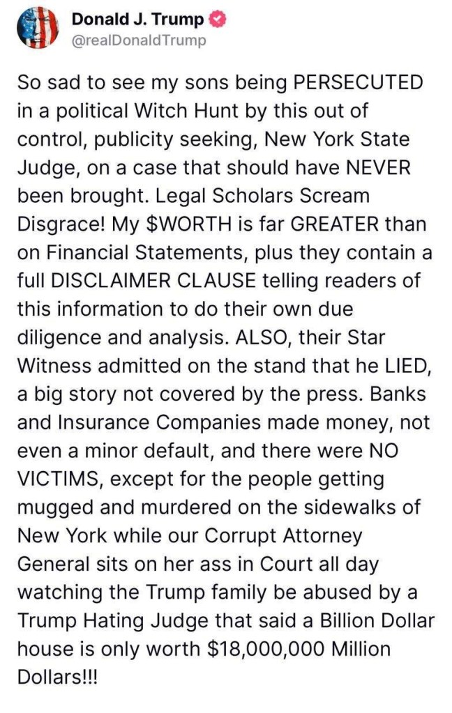 President Trump: The RIGGED Trial being “presided” over in Manhattan, without a jury allowed, by a TRUMP HATING, RADICAL LEFT, DEMOCRAT OPERATIVE JUDGE, has shown conclusively that the Trump Organization is Financially Strong, Powerful, Very Liquid, AND HAS DONE NOTHING WRONG. This Election Interference case, brought by Racist and Corrupt Attorney General Peekaboo James, in close coordination with Crooked Joe Biden and Washington, D.C., Fascists, Marxists, and Communists, is a disgrace. With ZERO evidence, and before the Trial even started, the Judge, Arthur Engoron, ruled viciously against me. He stated strongly that a Billion Dollar House was worth only $18,000,000. Likewise, but to a lesser extent, he did this with other properties, also. The A.G. laughed at him! This is a great Miscarriage of Justice, and while they want to settle, why should I be forced to settle when I did nothing wrong? The State should focus on reducing Taxes, fighting Violent Crime, & keeping businesses from leaving New York! —DJT