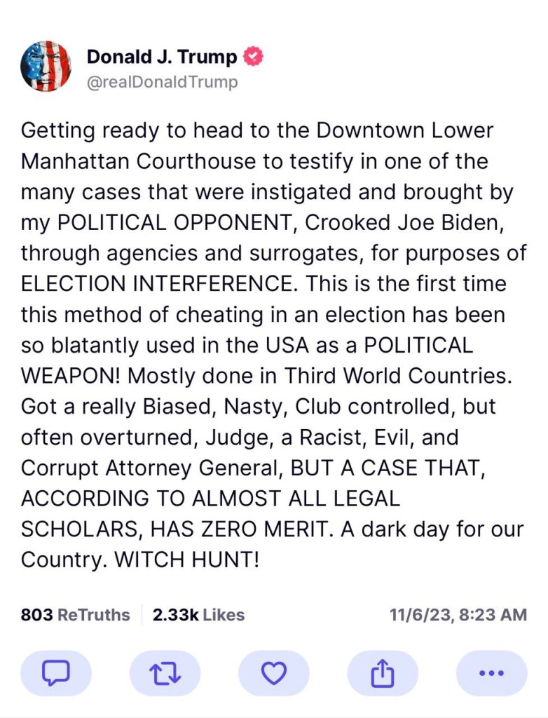 I spent the whole day in Manhattan Court, compliments of my Political Opponent, Crooked Joe Biden. Legal Scholars agree that this is a case that should have never been brought, and it wouldnât have if I wasnât running (and winning!) for President. MAGA! —DJT