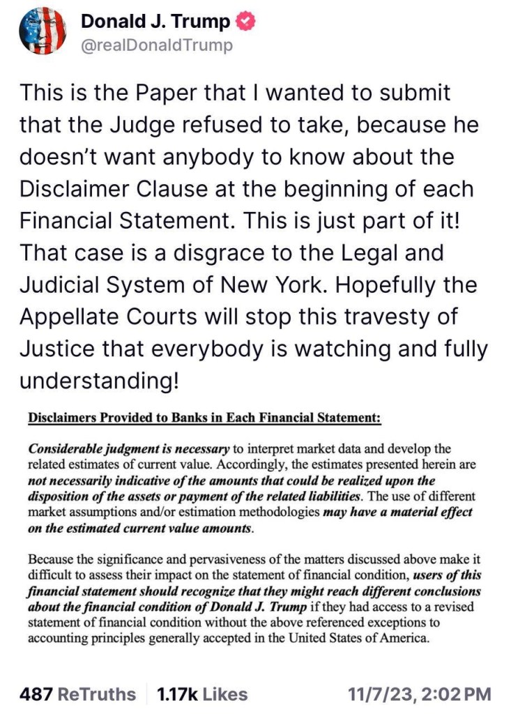 This is the Paper that I wanted to submit that the Judge refused to take, because he doesnât want anybody to know about the Disclaimer Clause at the beginning of each Financial Statement. This is just part of it! That case is a disgrace to the Legal and Judicial System of New York. Hopefully the Appellate Courts will stop this travesty of Justice that everybody is watching and fully understanding! —DJT