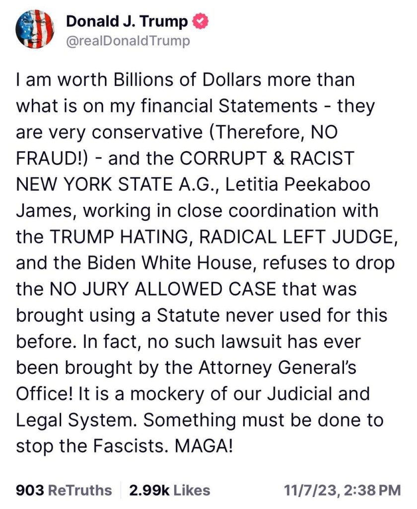 I am worth Billions of Dollars more than what is on my financial Statements – they are very conservative (Therefore, NO FRAUD!) – and the CORRUPT & RACIST NEW YORK STATE A.G., Letitia Peekaboo James, working in close coordination with the TRUMP HATING, RADICAL LEFT JUDGE, and the Biden White House, refuses to drop the NO JURY ALLOWED CASE that was brought using a Statute never used for this before. In fact, no such lawsuit has ever been brought by the Attorney Generalâs Office! It is a mockery of our Judicial and Legal System. Something must be done to stop the Fascists. MAGA! —DJT