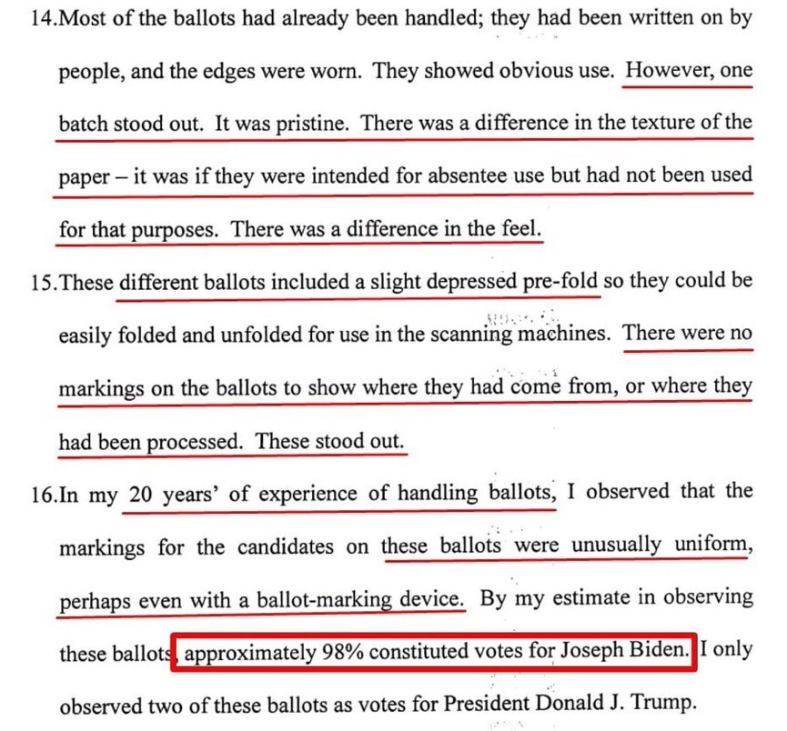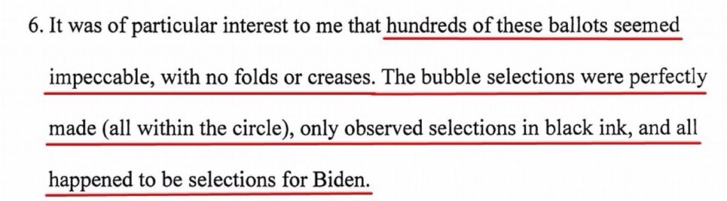 “Hundreds of these ballots seemed impeccable, no folds or creases. The bubble selections were perfectly made… only black ink, and all.. for Biden.”