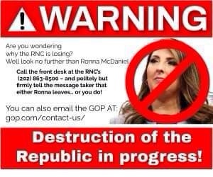Ever since Mitt Romney’s niece, Ronna McDaniel, was installed as the chairperson of the Republican National Committee (RNC) WE HAVE BEEN LOSING MORE AND MORE OF OUR REPUBLIC!