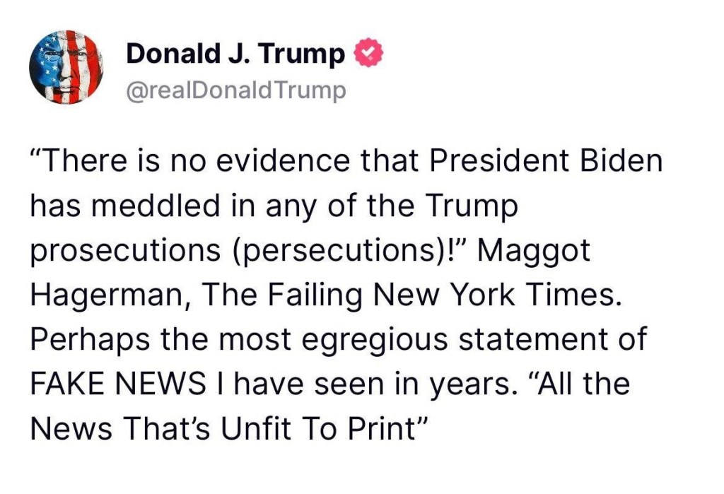 President Trump just posted this on Truth Social. He said he’s heading back to court in NYC this morning to see the crooked Judge Arthur Engoron and “batshit CRAZY (and Racist) AG Letitia James.”