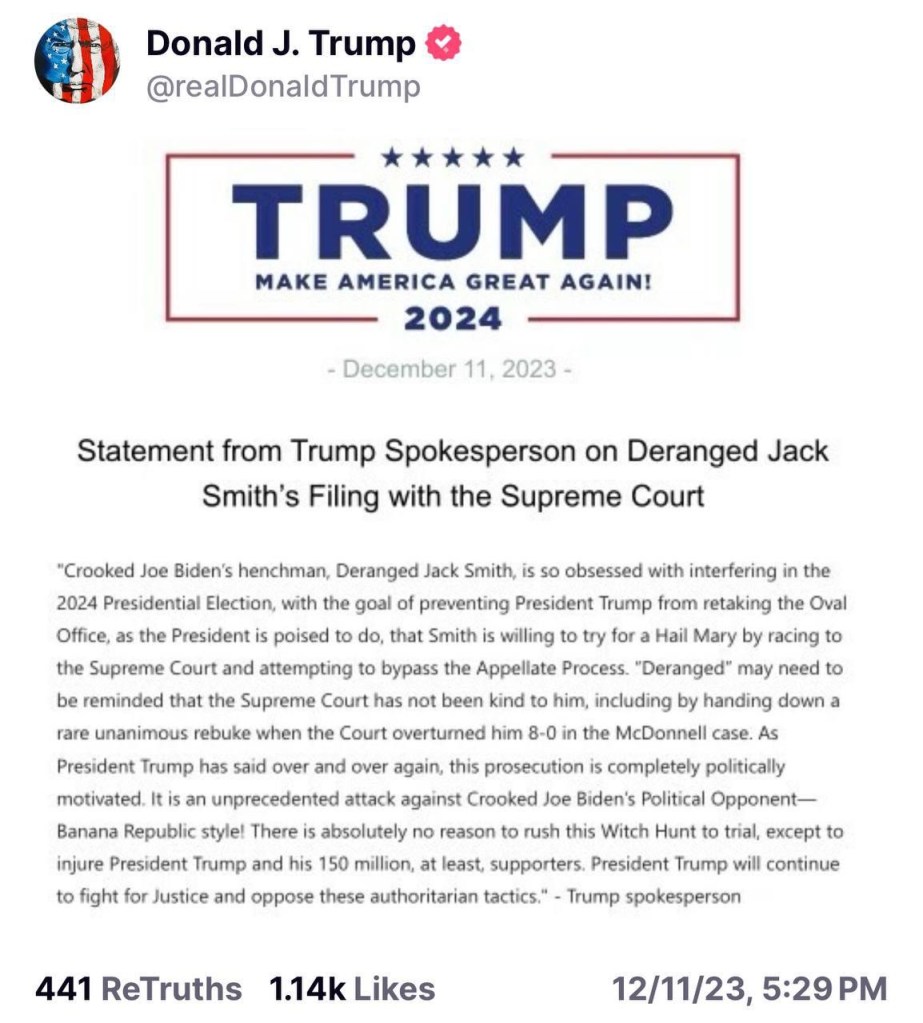 Did I miss something? In SCOTUS request, Jack Smith repeatedly says it’s super important Trump immunity issue be decided quickly. But he doesn’t say *why* it must be decided quickly. Obviously, that is so Trump can be tried, convicted, and sentenced before 2024 election. Why not explicitly say so? supremecourt.gov/DocketPDF/23/2…