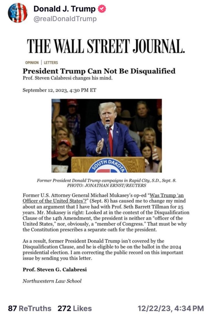 I fully expect the USSC to throw this case out, it should be a 9-0 vote (we’ll see) and a decision must be made immediately to reinstate Trump because ballots for Colorado are supposed to be to go to print in early January. And this should shut down all the other states foolish enough to violate our constitution—this all has to stop and stop now!