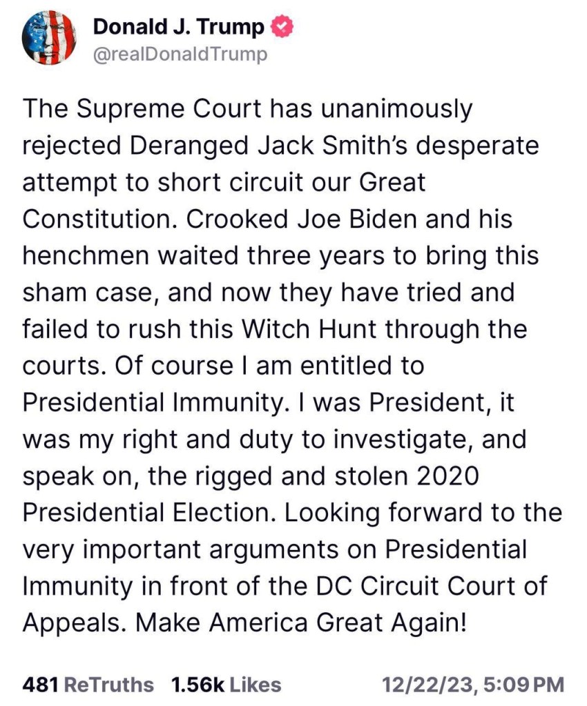BREAKING: Supreme Court will not take up ‘immunity’ case of Donald Trump. Jack Smith was attempting to skip over the appellate court on Trump’s presidential immunity challenge so he could try him before the 2024 election.