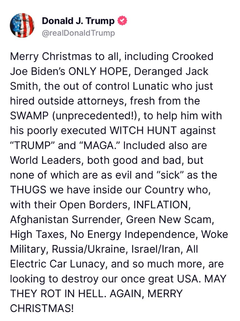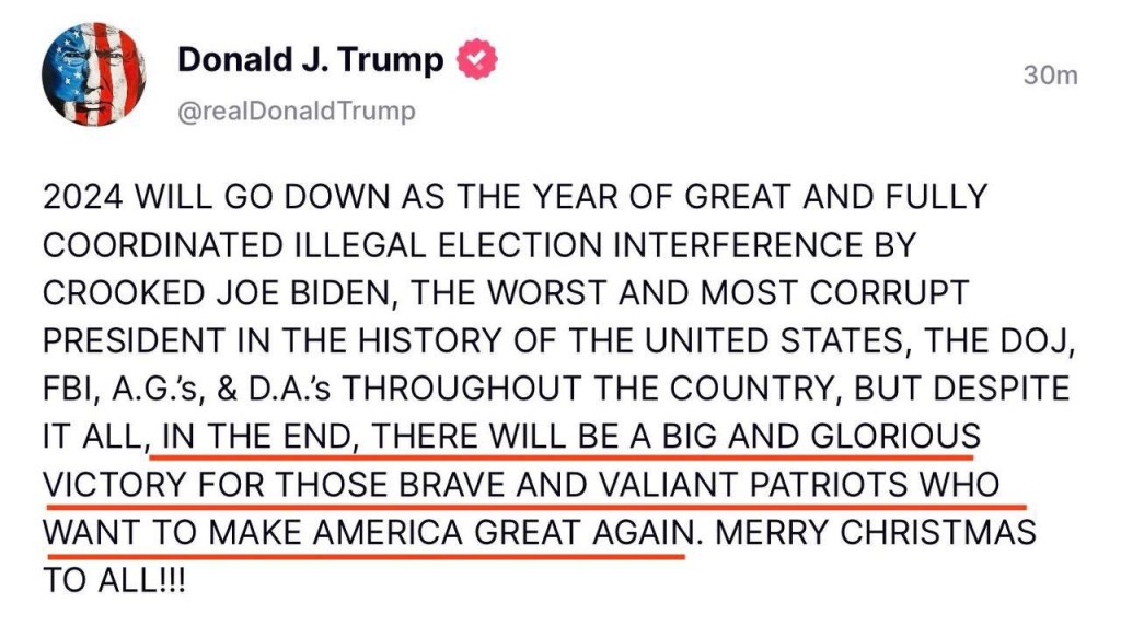 “In the end, there will be a big and glorious victory for those brave and valiant patriots who want to Make America Great Again. Merry Christmas to all!!!”