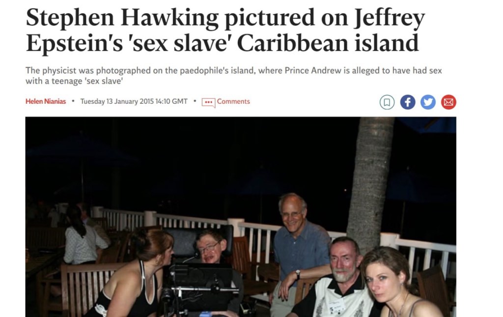 Your scientists and so called professionals have been compromised by blackmail and evil. Even Stephen Hawking, a man who couldn’t leave wheel chair, visited Epstein’s Island.