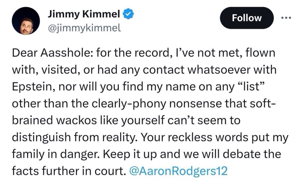 Aaron Rodgers is stating that Jimmy Kimmel will be on the Epstein client list.