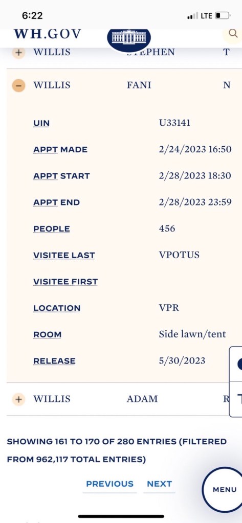 NEW: We have uncovered a record of Fani Willis visiting the White House on 2/28/23 —Mike Howell