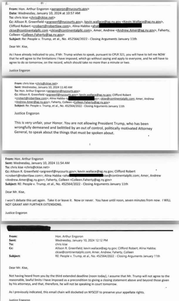 Meanwhile, Trump was originally allowed to give his closing arguments and then yesterday, crooked Judge Engoron denied Trump the ability to give his own closing argument today.