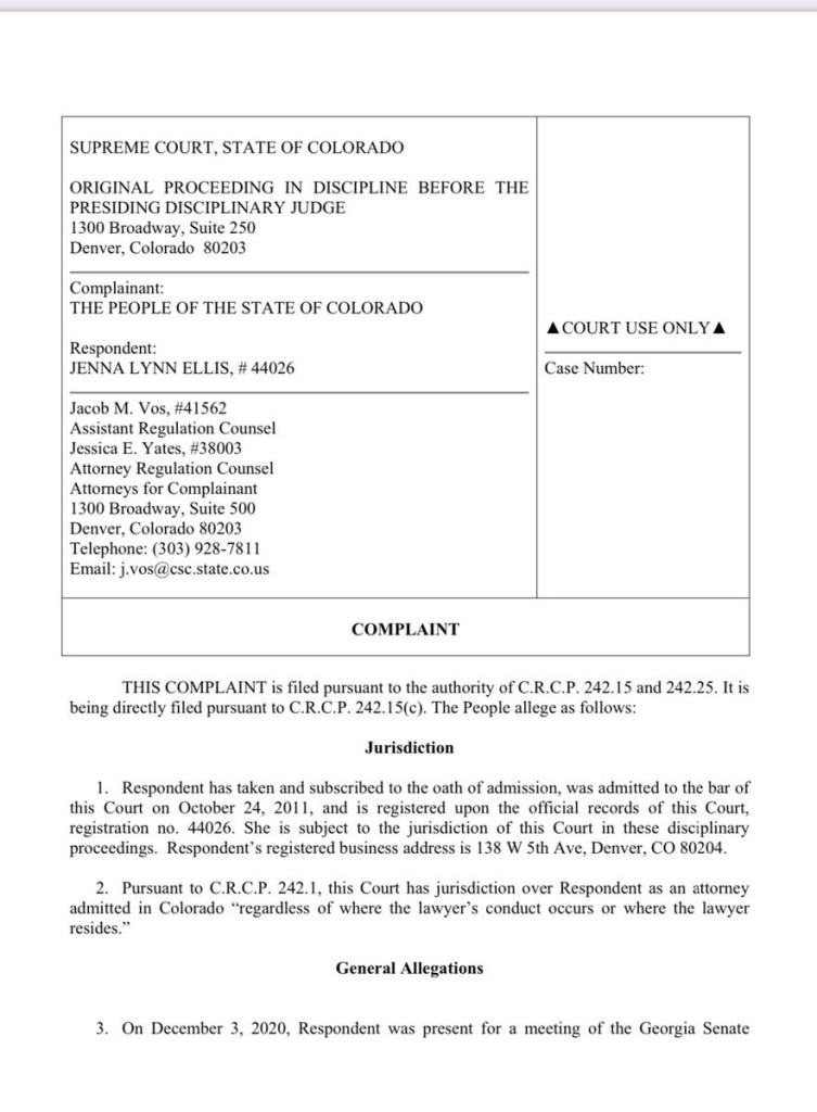 A complaint has just been filed by the people of Colorado against Disgraced sellout “lawyer” Jenna Ellis, who has flipped to be one of Fani Willis’s witnesses against President Trump in Fulton County, Georgia.