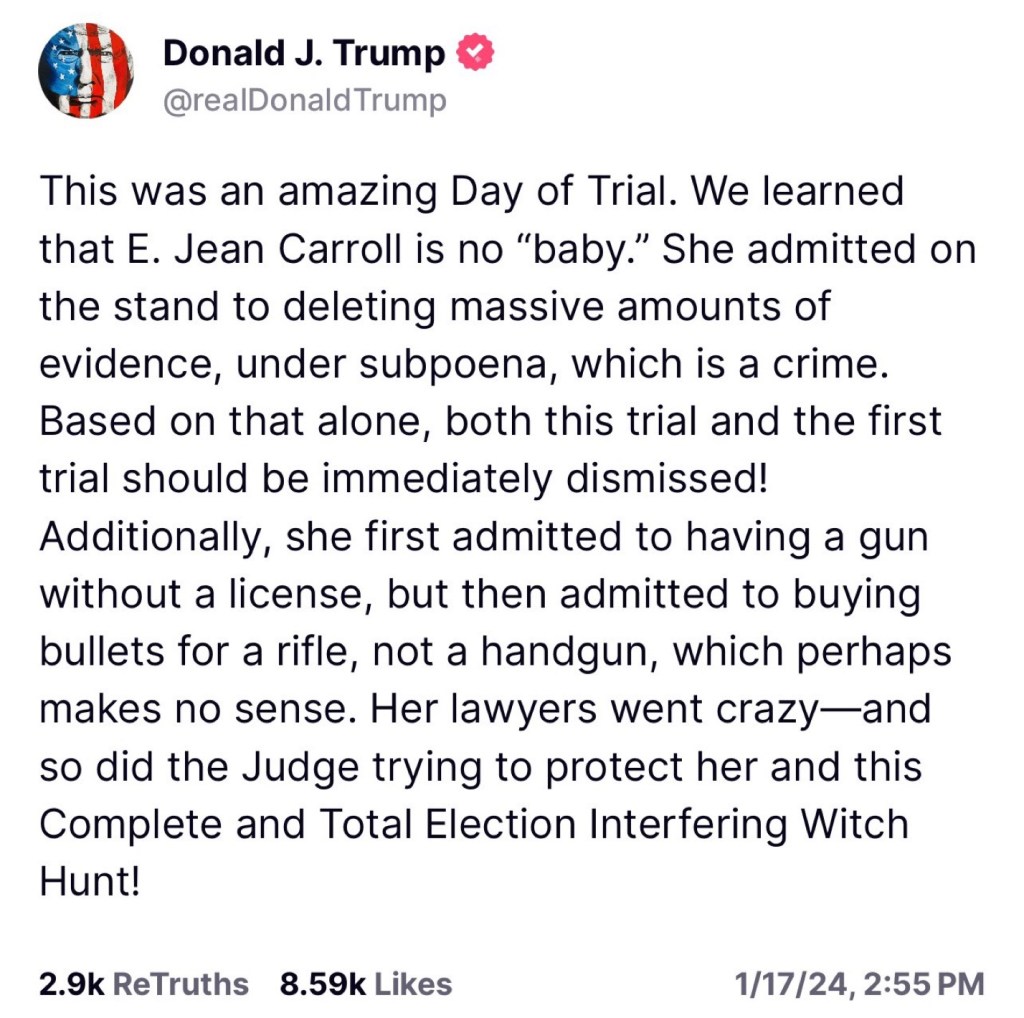Peesident Trump: I feel an obligation to be at every moment of this ridiculous trial because we have a seething and hostile Clinton-appointed Judge, Lewis Kaplan, who suffers from a major case of Trump Derangement Syndrome. In the first trial, with the same Judge, where I was asked not to go by my lawyers because it was “beneath me as a former President of the United States,” he was reported to have been extraordinarily hostile to our side. But I should have gone, if for no other reason than to witness and speak up against the abuse carried out by this Judge. There was no way that case should have been lost! I was accused of something that I didn’t do. Now, because I want to be at this Witch Hunt 100% of the time and watch what is going on, my attorneys asked the Judge for a one day delay so that I can attend the funeral of my beloved mother-in-law, with my wife and entire family, tomorrow in Palm Beach, Florida.… —DJT