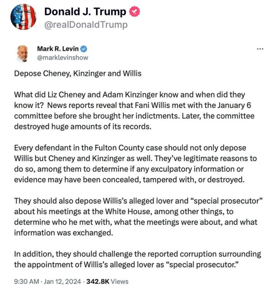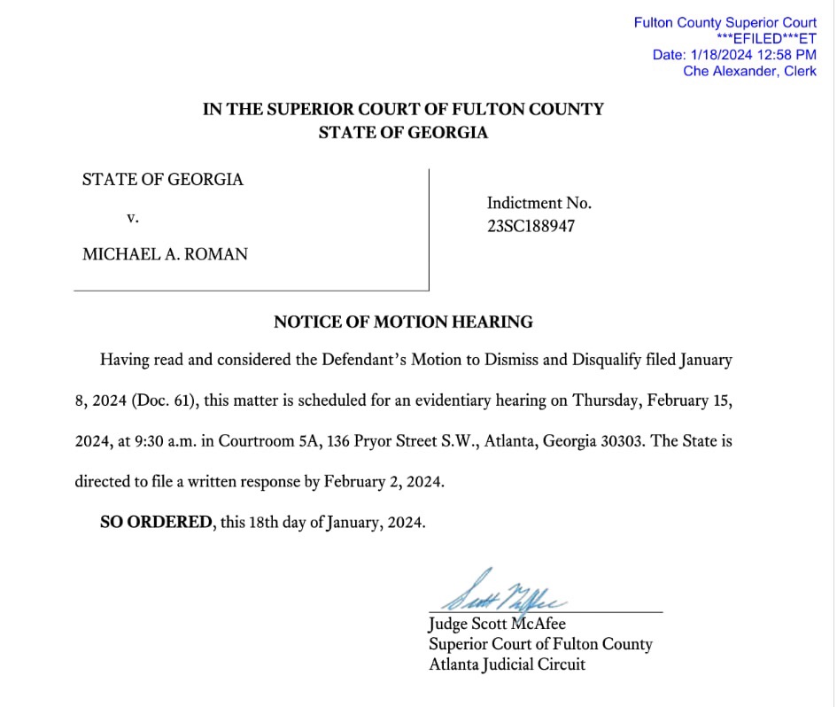 A Fulton County Judge has scheduled an evidentiary hearing for February 15 on the motion to disqualify DA Fani Willis and Special Prosecutor Nathan Wade (also at issue is the motion to dismiss the RICO case against Trump, et al.).
