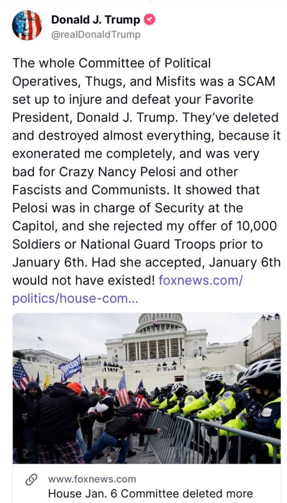 President Trump: The whole Committee of Political Operatives, Thugs, and Misfits was a SCAM set up to injure and defeat your Favorite President, Donald J. Trump. They’ve deleted and destroyed almost everything, because it exonerated me completely, and was very bad for Crazy Nancy Pelosi and other Fascists and Communists. It showed that Pelosi was in charge of Security at the Capitol, and she rejected my offer of 10,000 Soldiers or National Guard Troops prior to January 6th. Had she accepted, January 6th would not have existed! —DJT