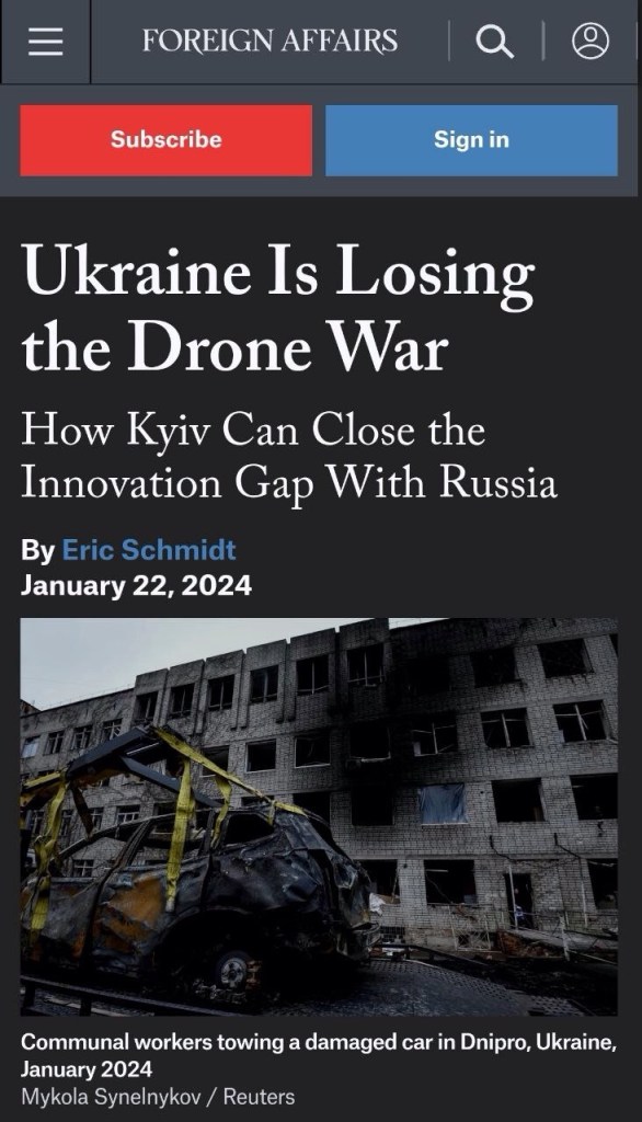 ▪️Schmidt admits Russia has copied “Ukrainian” drone innovations like FPVs + has 2 drones Ukraine has no equivalent of (Lancet & Orlan);