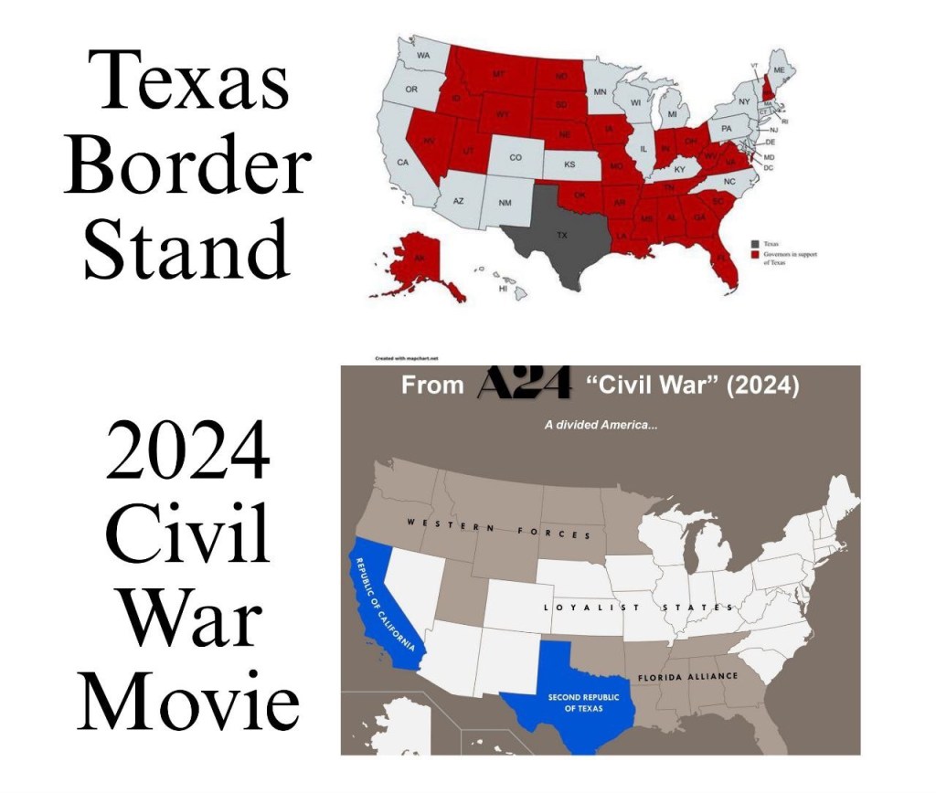 Can’t help but think about the fact that we’re now seeing blatant state defiance against the “Biden administration” where they are displaying maps of rebellion while at the same time the 2024 Civil War Movie coming out in April of this year is seeding its own map of secession.