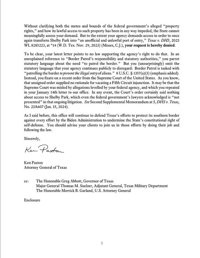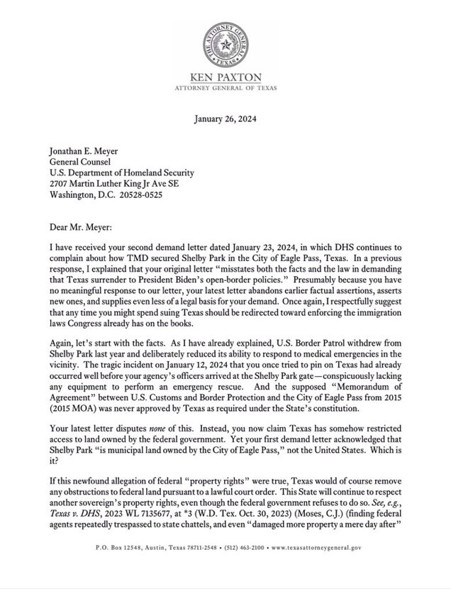 BREAKING ACCESS DENIED: Texas Attorney General @KenPaxtonTX responds to DHS denying the agency’s demands to get access to Shelby Park in Eagle Pass—Paxton makes a list of counter-demands: