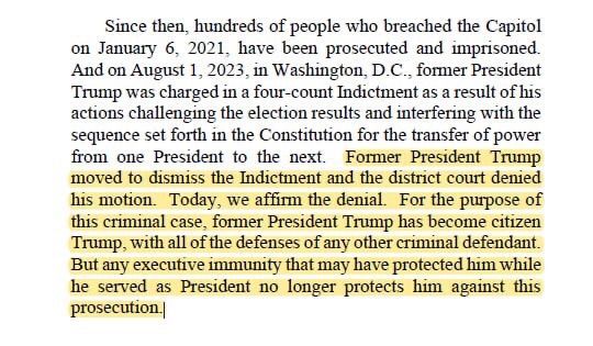 Quote: “Any executive immunity that may have protected him while he served as President no longer protects him against this prosecution.”