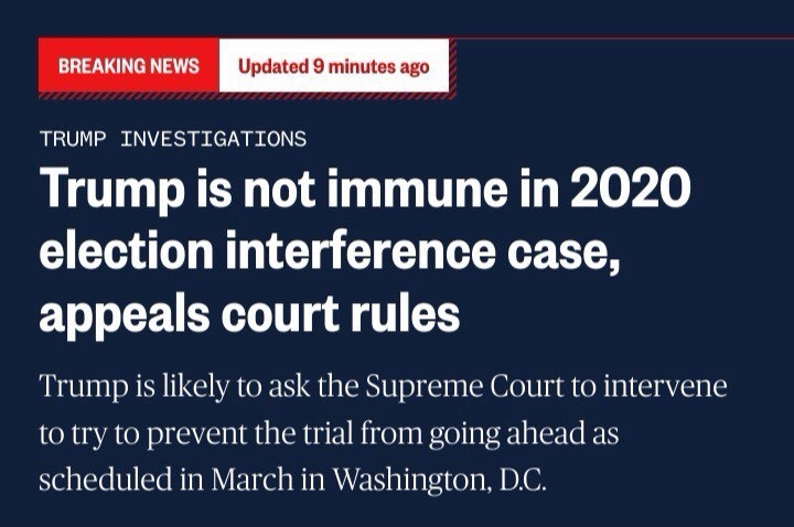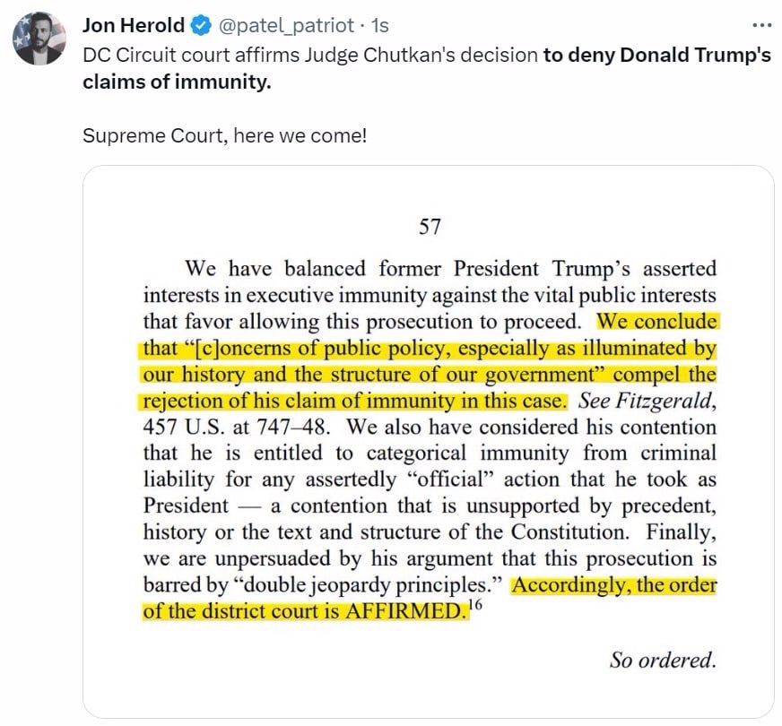 From someone close to the DC Circuit case and today’s ruling on presidential immunity: “Totally expected; we’ll be moving on up, exactly as expected.”