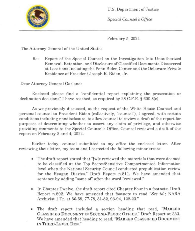Read the report here: https://www.justice.gov/storage/report-from-special-counsel-robert-k-hur-february-2024.pdf