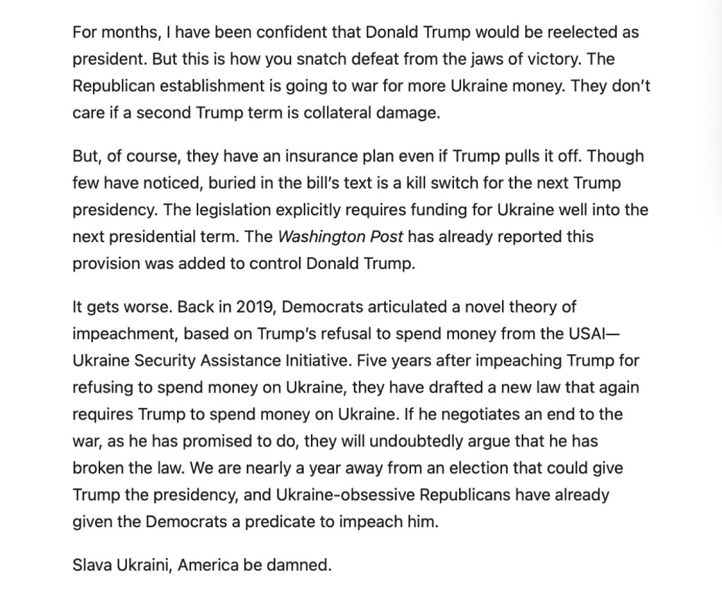“Buried In the bill’s text is a kill switch for the next Trump presidency. The legislation explicitly requires funding for Ukraine well into the next presidential term.”