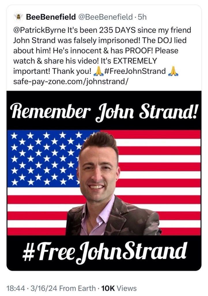 #FreeJohnStrand John is a wonderful, gentle fellow, who was looking out for physician Simone Gold on J6 when she walked into the Capitol and read a statement on medical freedom from the rotunda. Then walked out when the police said to. He’s facing seven years.