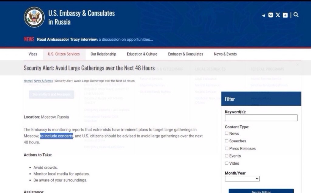 So two weeks ago, the US State Dept issues an alert that there may be a terrorist attack on a concert in Moscow