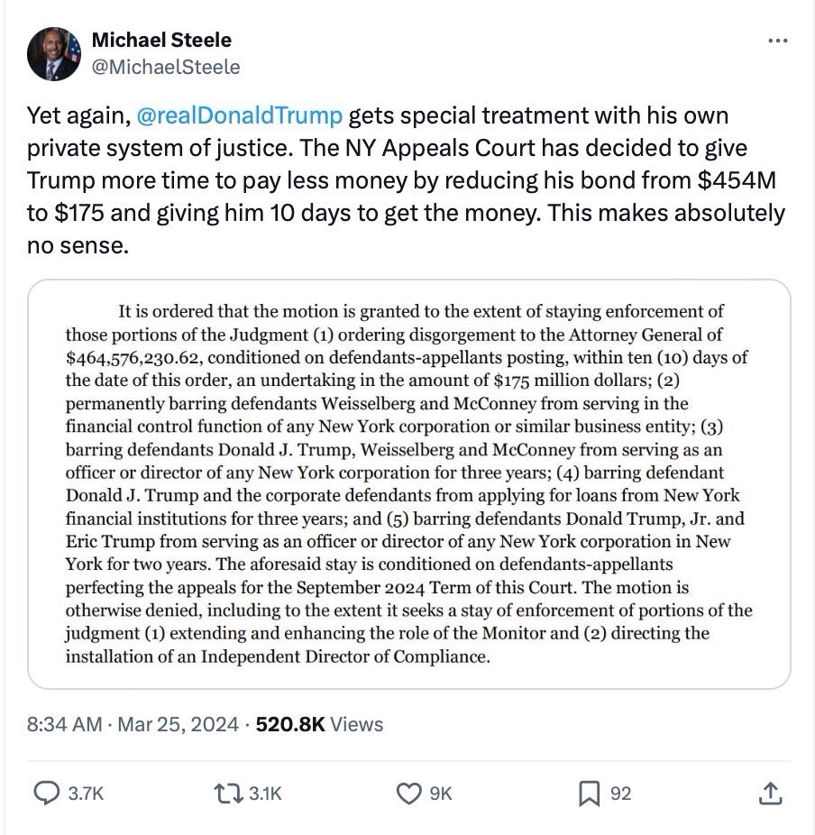 Michael Steele, a former RNC head turned left-wing pundit (lot of those to go around) says Donald Trump’s record-setting bond amount was only lowered due to “special treatment” from the courts.
