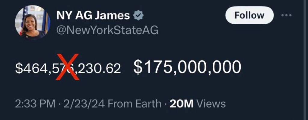 Of course, the only reason Trump is forced to put up a $175 million bond in the first place is because of Letitia James’ “special treatment” where she ran for AG to “get Trump.”