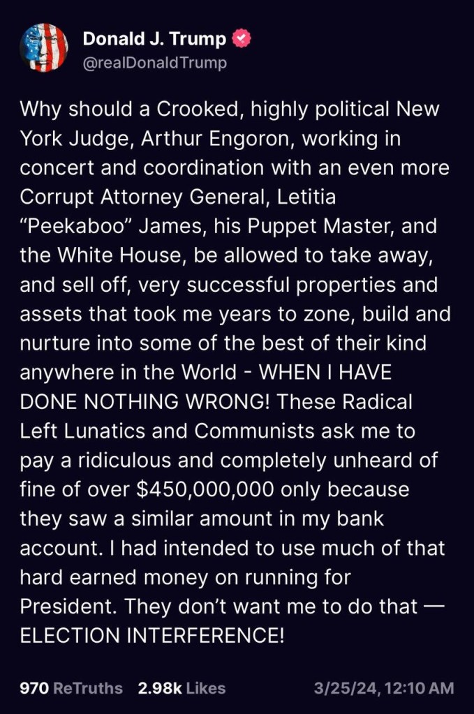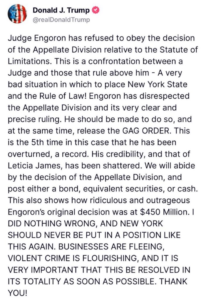 “We will abide by the decision of the Appellate Division, and post either a bond, equivalent securities, or cash. This also shows how ridiculous and outrageous Engoron’s original decision was at $450 Million. I DID NOTHING WRONG.”