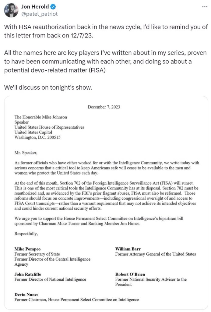 The Leader of the Republican Party just told the truth about the FISA bill that Speaker Johnson is bringing to the floor.