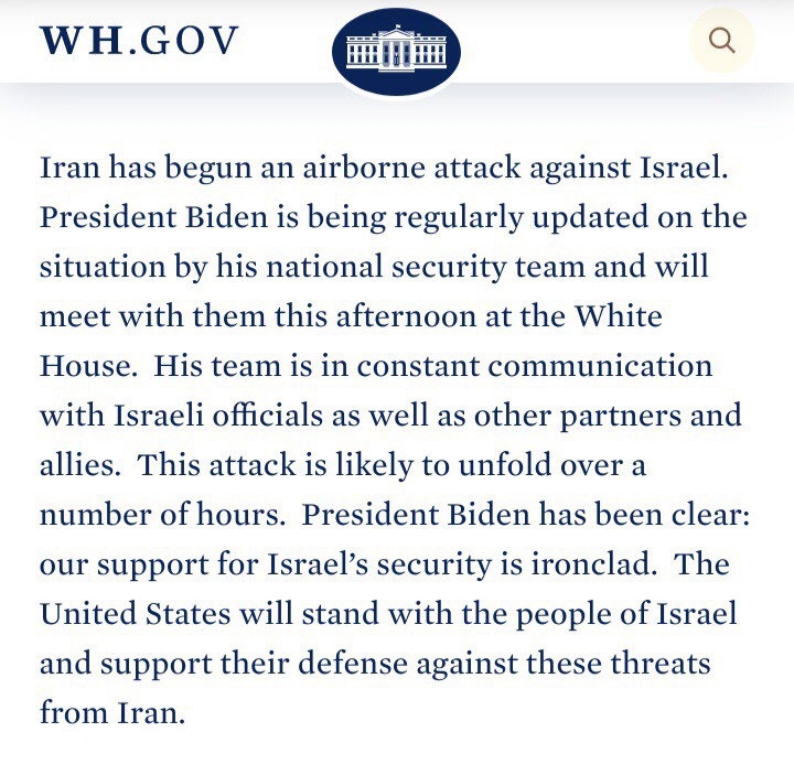 BREAKING: Iran has begun an airborne attack against Israel. This attack is likely to unfold over a number of hours. President Biden has been clear: our support for Israel’s security is ironclad. The United States will stand with the people of Israel and support their defense against these threats from Iran.