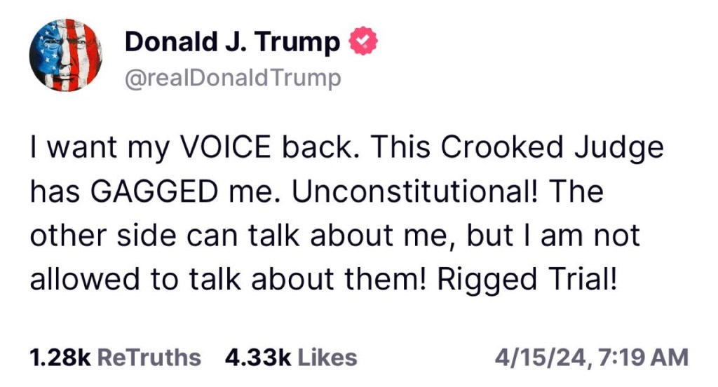 I want my VOICE back. This Crooked Judge has GAGGED me. Unconstitutional! The other side can talk about me, but I am not allowed to talk about them! Rigged Trial!
