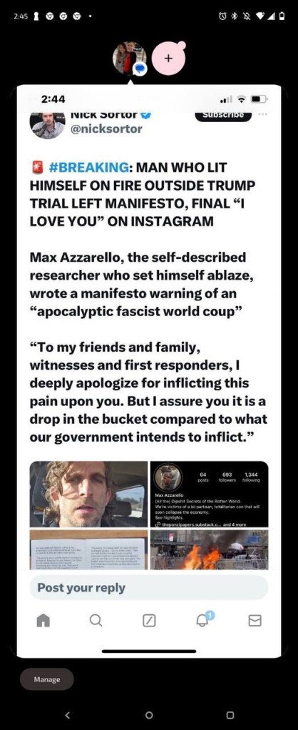 My name is Max Azzarello, and I am an investigative researcher who has set himself on fire outside of the Trump trial in Manhattan.