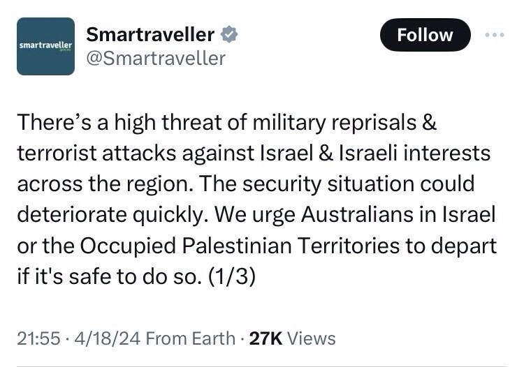 Australia’s Department of Foreign Affairs and Trade has issued a travel alert, advising Australian citizens in Israel to immediately leave the country.