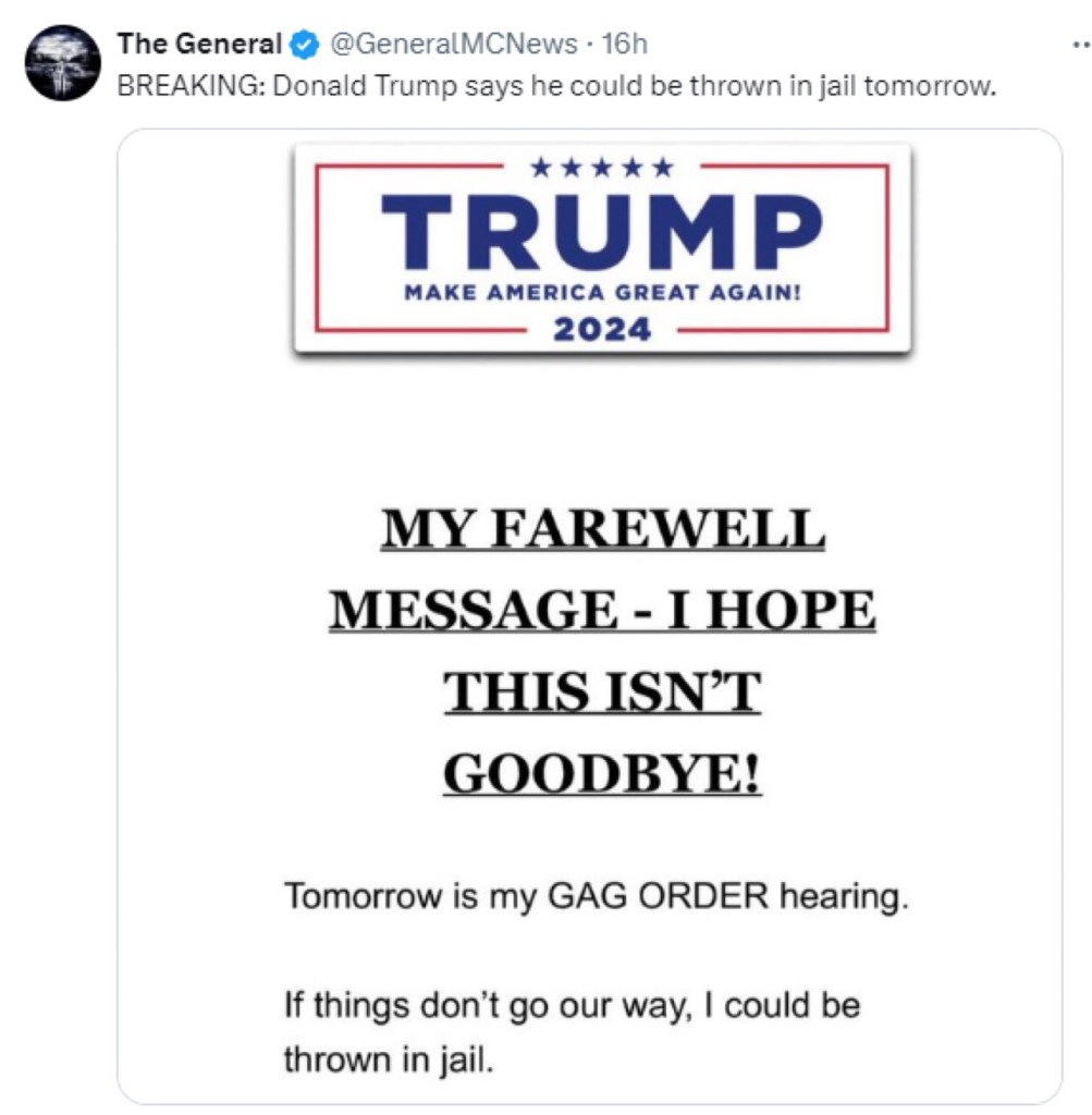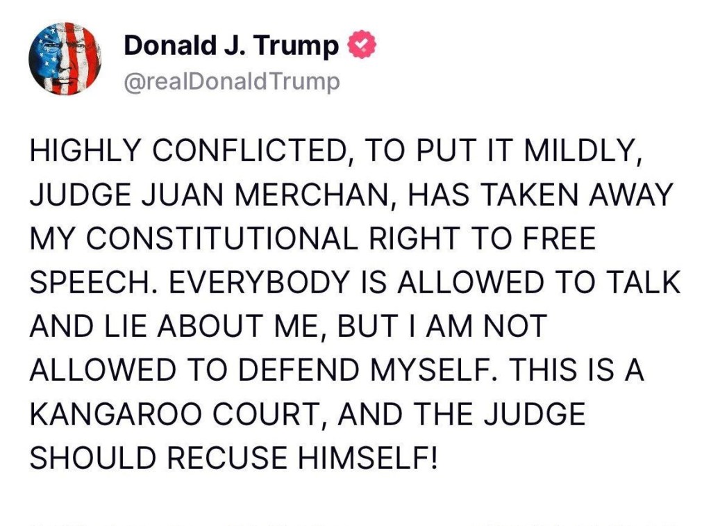 President Trump after the court adjourned today: “I don’t think anybody’s ever seen anything like this. I’d love to talk to you people. I’d love to say everything that’s on my mind, but I’m restricted because they have a gag order.”
