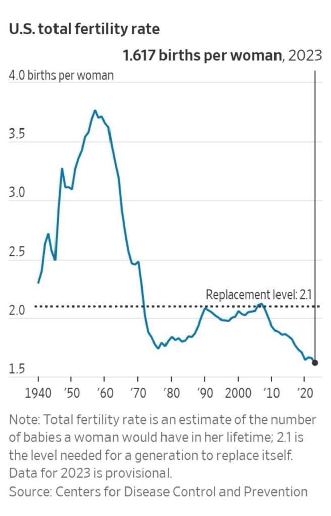 The U.S. fertility rate fell to just 1.6 children per woman in 2023. It’s the lowest figure in American history. America had fewer children born last year than in 1980, when we had 100 million fewer people.