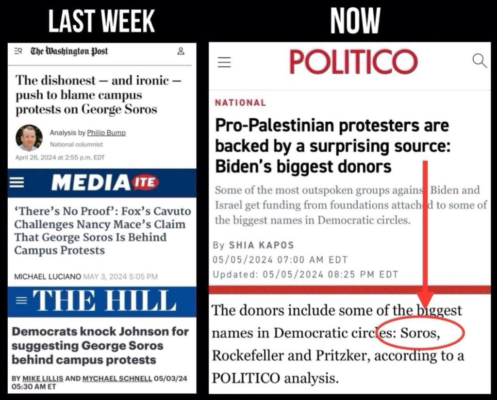 ICYMI, here’s Neil Cavuto 3 days ago denying that George Soros is funding the campus protestors, which even Politico now admits is true.