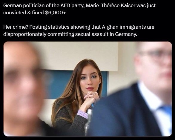 A German politician was just fined $6000 for posting migrant rape statistics.