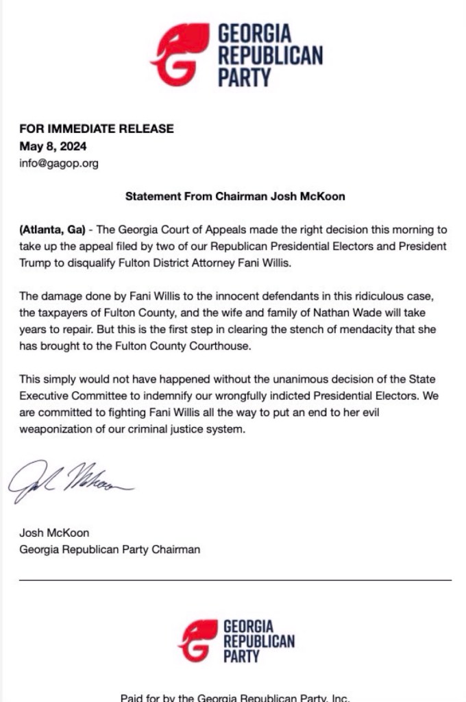 Statement from Chairman @JoshMcKoon on the decision of the Georgia Court of Appeals to take up the appeal to disqualify @FaniforDA from her bogus case against our Presidential Electors and former President @realDonaldTrump #gapol #gagop