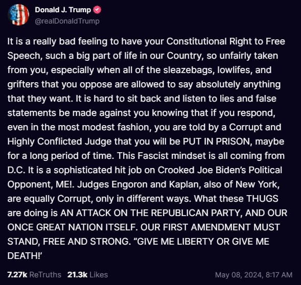 It is a really bad feeling to have your Constitutional Right to Free Speech, such a big part of life in our Country, so unfairly taken from you, especially when all of the sleazebags, lowlifes, and grifters that you oppose are allowed to say absolutely anything that they want. It is hard to sit back and listen to lies and false statements be made against you knowing that if you respond, even in the most modest fashion, you are told by a Corrupt and Highly Conflicted Judge that you will be PUT IN PRISON, maybe for a long period of time. This Fascist mindset is all coming from D.C. It is a sophisticated hit job on Crooked Joe Biden’s Political Opponent, ME!. Judges Engoron and Kaplan, also of New York, are equally Corrupt, only in different ways. What these THUGS are doing is AN ATTACK ON THE REPUBLICAN PARTY, AND OUR ONCE GREAT NATION ITSELF. OUR FIRST AMENDMENT MUST STAND, FREE AND STRONG. “GIVE ME LIBERTY OR GIVE ME DEATH!’